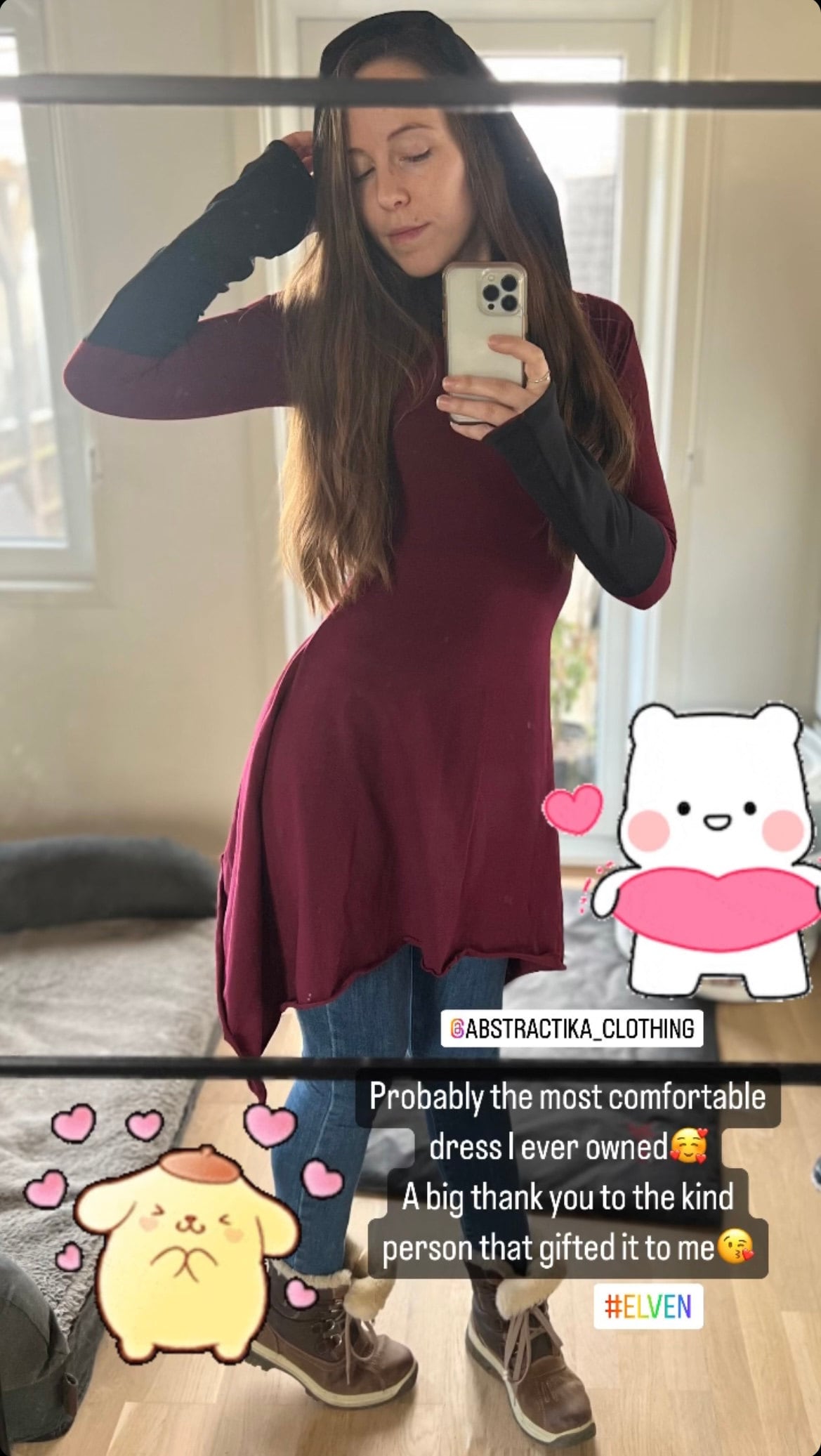 It’s probably the most comfortable and beautiful dress I have ever owned! It fits perfectly, snug but still loose enough, and the fabric hugs your body in a gentle way, making the dress fall perfectly into place. The only thing that would make it even more perfect for a detail oriented ADHDer like myself, is that the stitching of the black edge around the hood would allign perfectly, because sadly, it doesn’t on my dress.